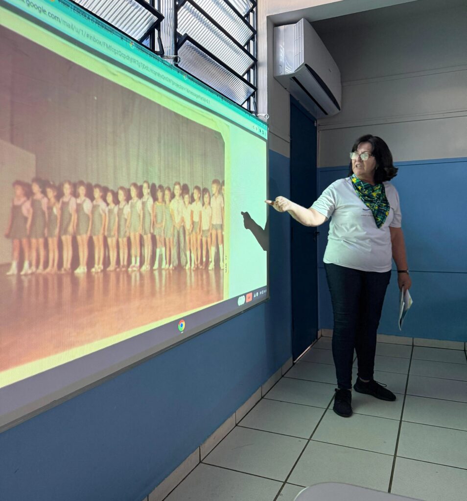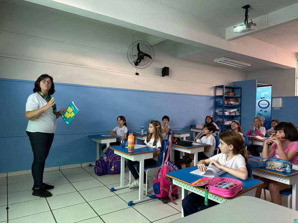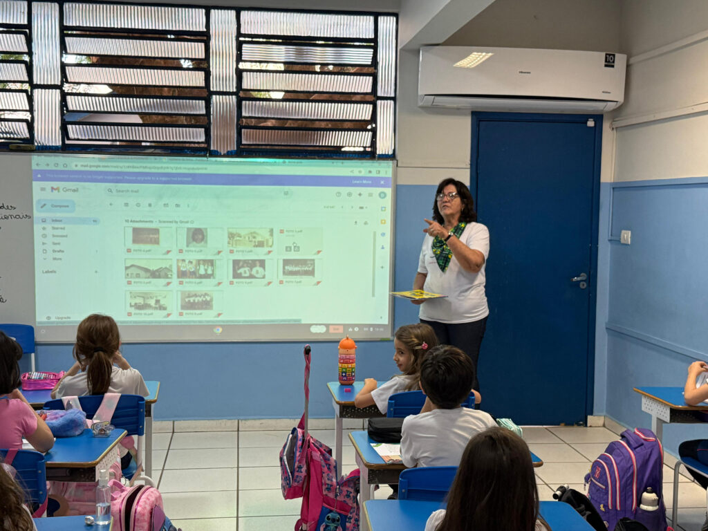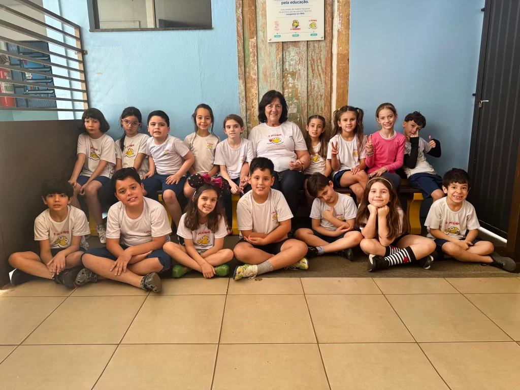Os alunos do 2º Ano tiveram a oportunidade de conhecer a história d’O Peixinho de forma mais aprofundada pelas palavras da secretária da escola, Tânia Adam Barros, a colaboradora mais antiga do ‘aquário’. Há 47 anos, ela se dedica com gentileza e amor ao atendimento das famílias e dos alunos.