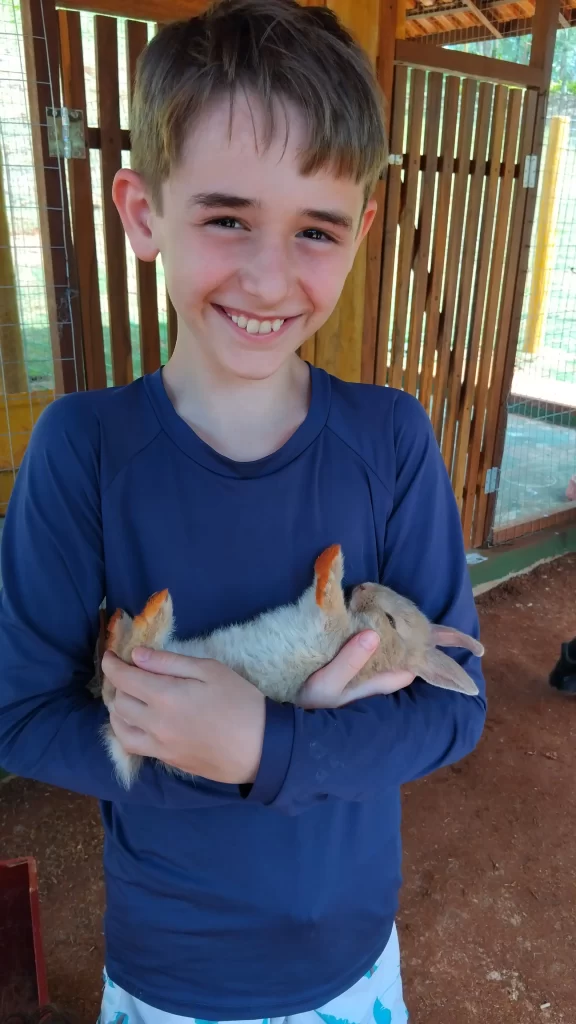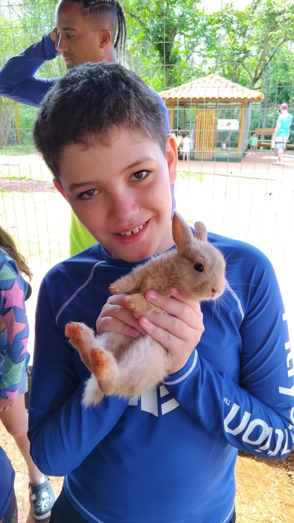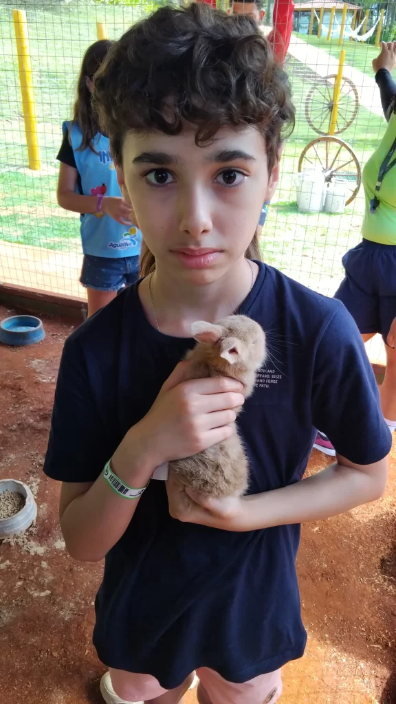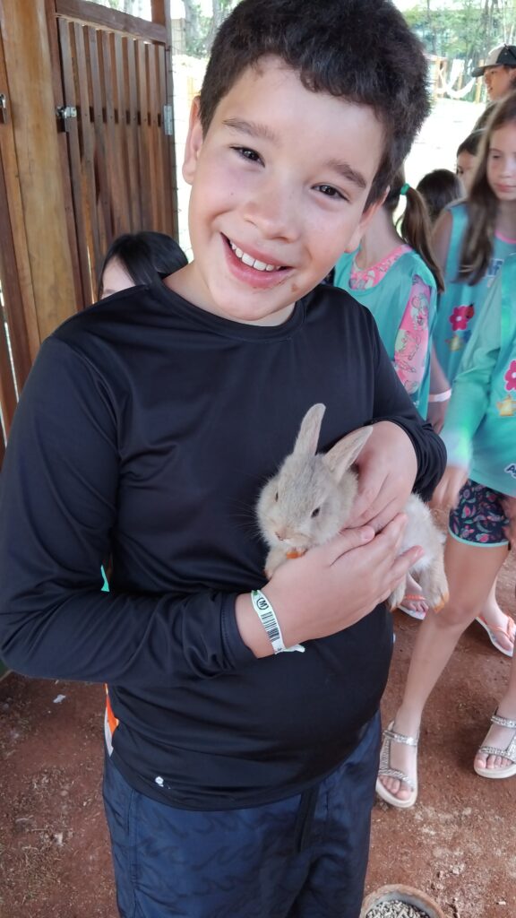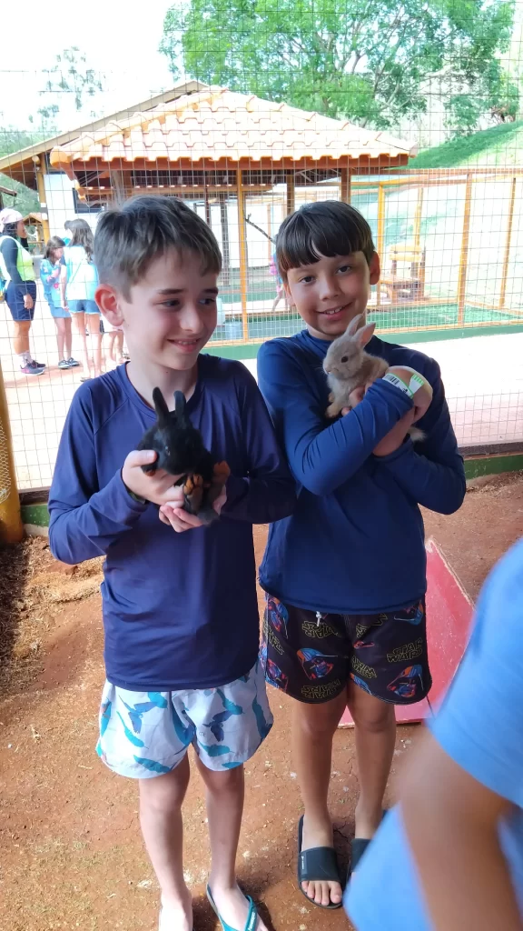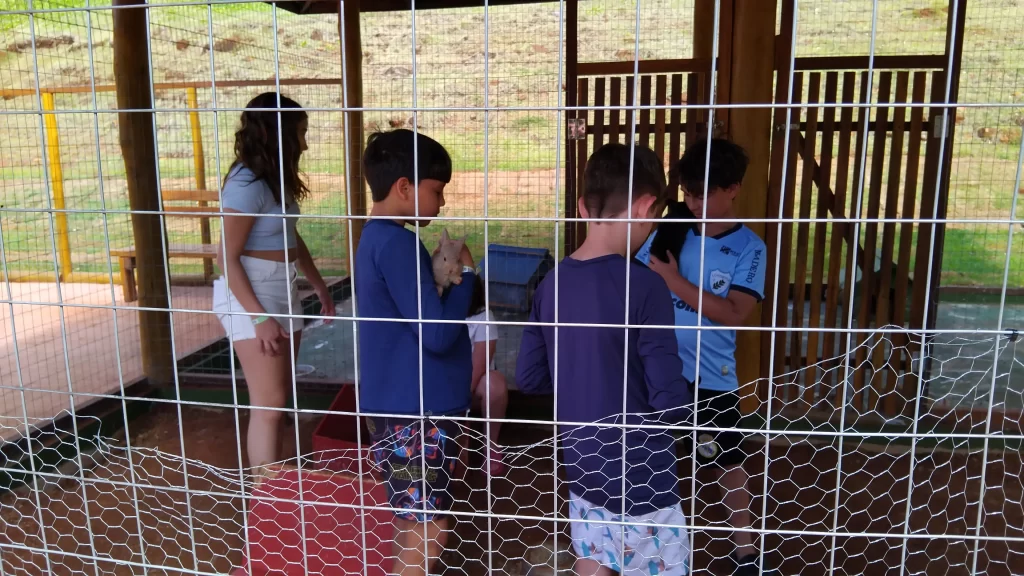No segundo dia, os alunos tiveram contato com a natureza na visita à Fazendinha. Lá, viram alguns animais como pavões, galinhas-d’angola, pintinhos, cabrita e coelhos. Ainda deu tempo da criançada curtir as piscinas e relaxar nas banheiras de hidromassagem.