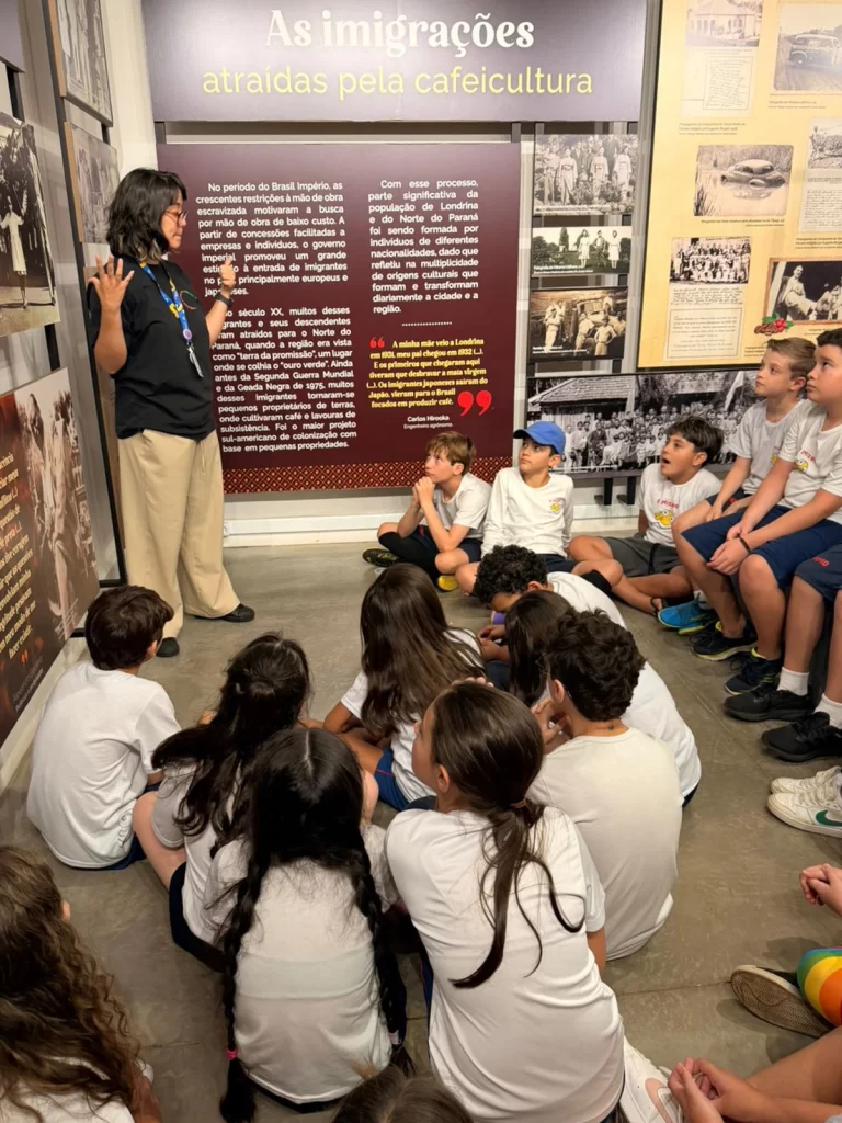 Com o objetivo de enriquecer o processo de ensino e aprendizagem por meio de experiências significativas culturais e históricas, a Escola O Peixinho organizou uma visita ao Museu do Café para os alunos dos 4º e 5º anos, no último dia 11. A proposta aproximou as crianças da história local, incentivou a valorização do patrimônio cultural e despertou o interesse pelo processo de cultivo e produção do café — elemento fundamental da identidade do norte paranaense.