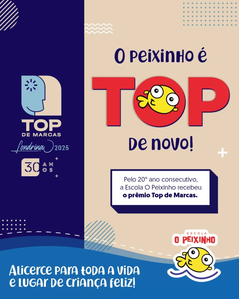 O Peixinho é a escola mais lembrada pelos londrinenses no Top de Marcas desde que o segmento Educação Infantil passou a integrar a pesquisa. Neste 20º ano consecutivo de conquista, saiu à frente das demais instituições da cidade com índice de 7,3% (contra 4,7% da segunda colocada). A cerimônia de premiação ocorreu no último dia 12, na Chácara Graciosa.