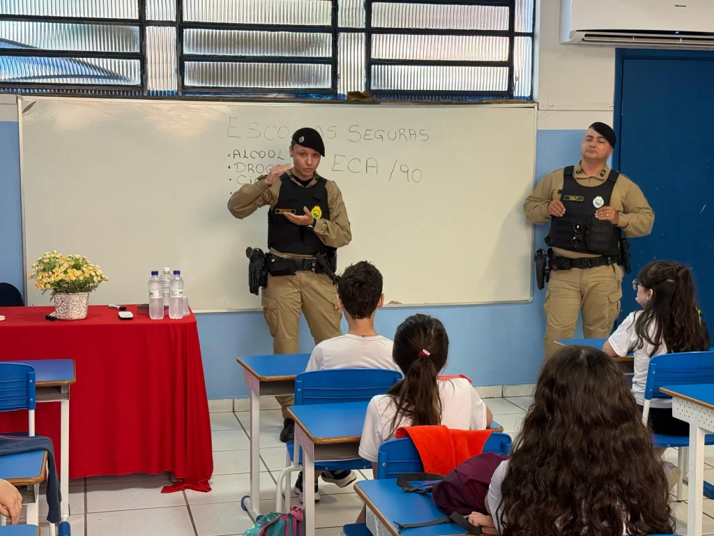 A sargento Cristina, o cabo Cambuí e a soldado Amanda, da 4ª Companhia do Batalhão da Patrulha Escolar Comunitária, explicaram como funciona a legislação e relataram situações de famílias desfeitas e jovens que perderam a saúde e a liberdade por se envolverem com drogas e álcool.