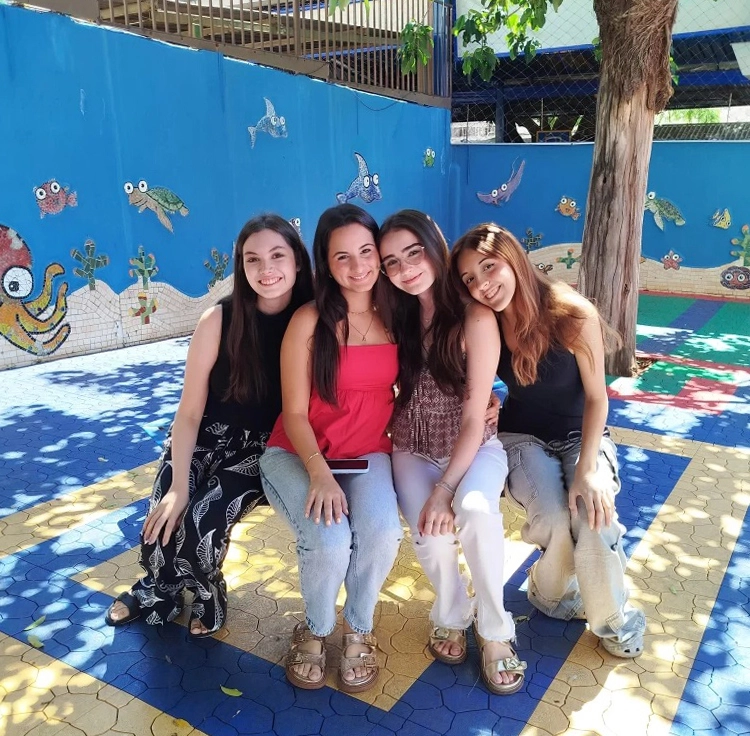 As quatro amigas começaram a estudar n’O Peixinho aos dois anos de idade e seguiram juntas até o 5º Ano do Ensino Fundamental. Aqui construíram muito mais do que aprendizados escolares, criaram vínculos que atravessaram o tempo. Mesmo depois de seguirem para escolas diferentes, permaneceram unidas. Nas férias, ao menos duas vezes ao ano, elas se encontram para matar a saudade e atualizar as histórias.